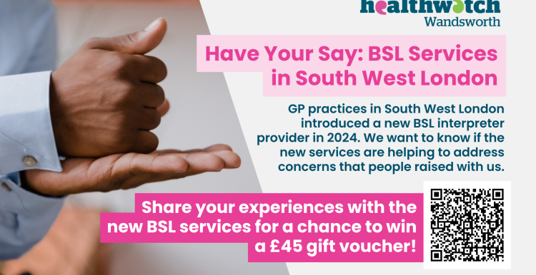 If you have used BSL interpreter service provided by your South West London GP practice since 1 October 2024, we want to hear your views. We will share anonymised experiences with the NHS commissioners of these services so that they can continue to improve them. We will also publish a short article with our findings on this website when it is ready.